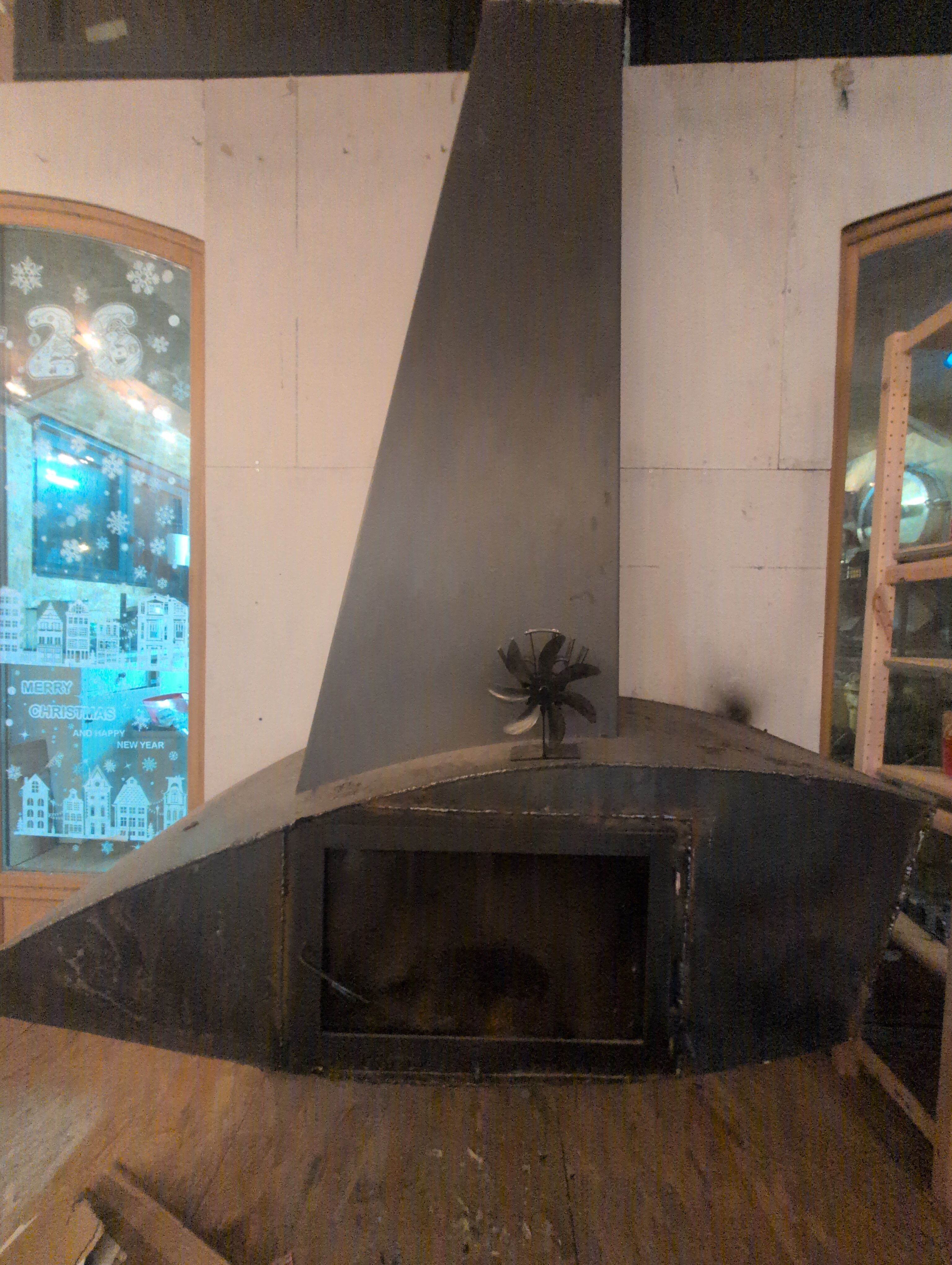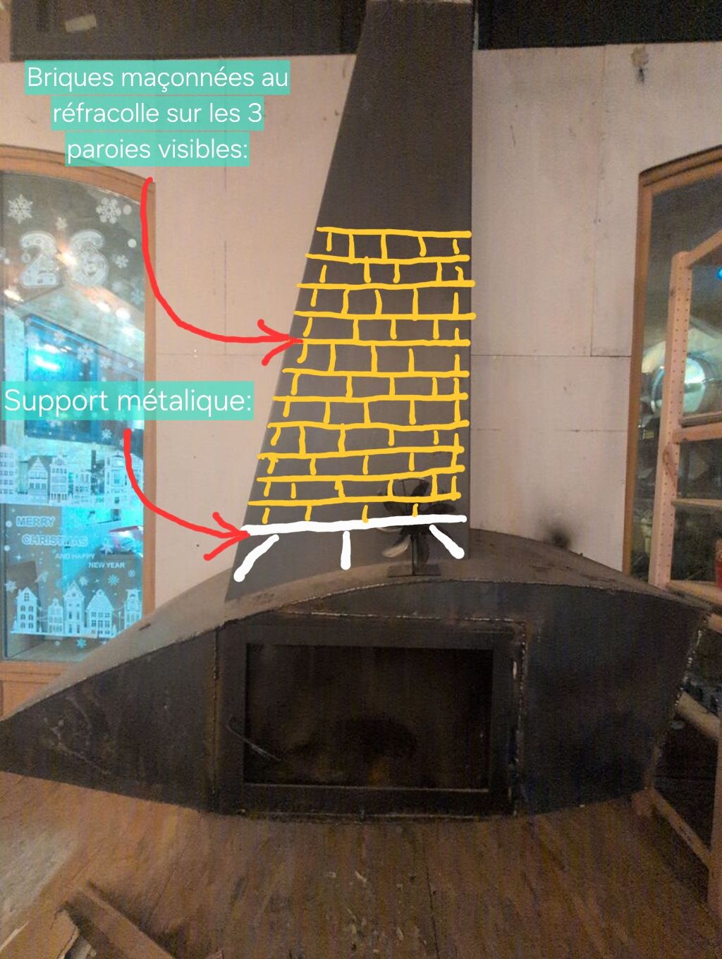 Sur la photo vous verrez la cheminé ouverte suspendu que j’ai rendu étanche et mis une trappe de four a pizza.