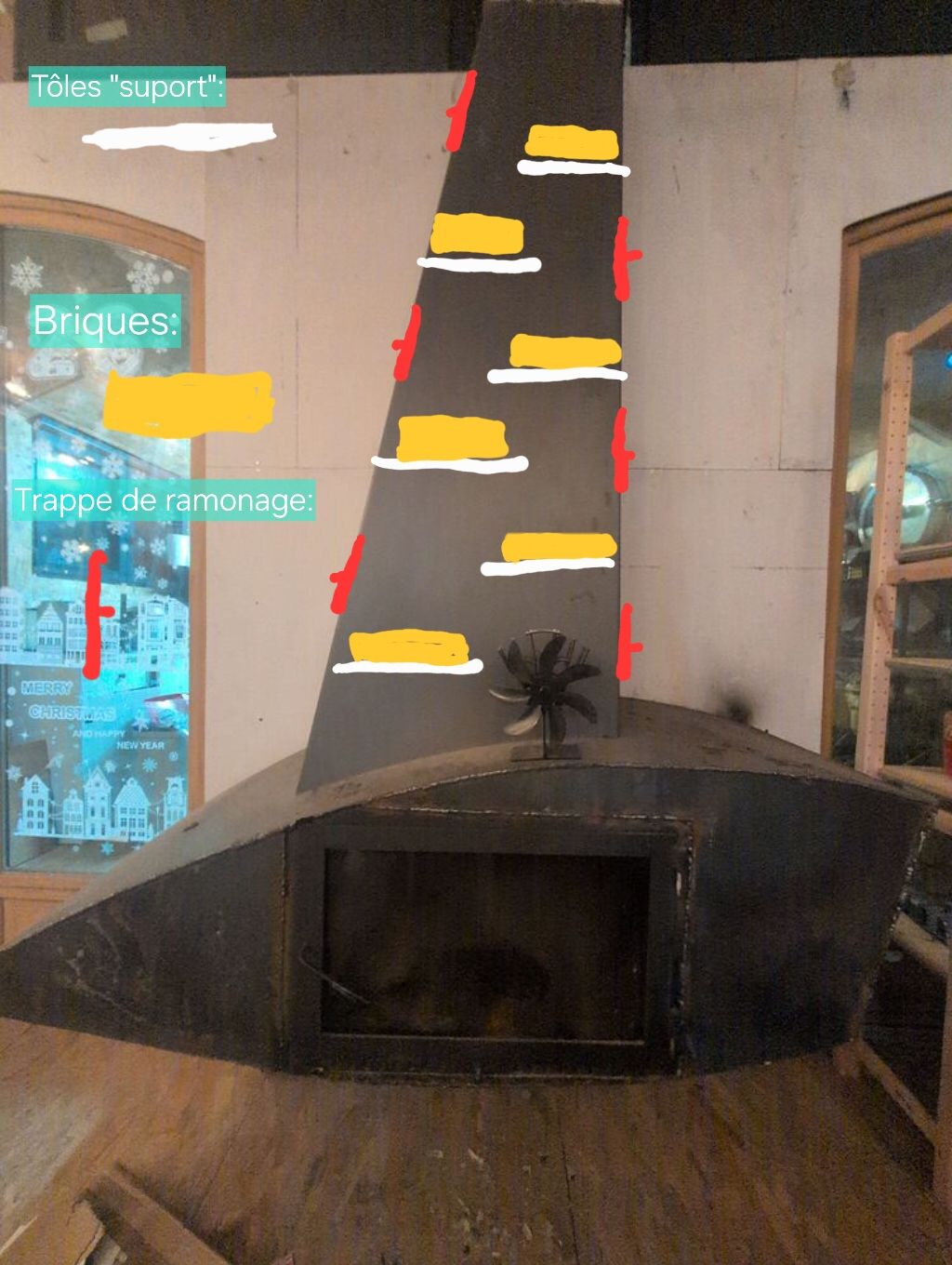 Ensuit, tu dis: "Mon idée c’est de créer une trappe dans le grand conduit et mettre de la tôle épaisse supportant des briques réfractaire, peut être que les tôles devrait sortir pour diffuser."