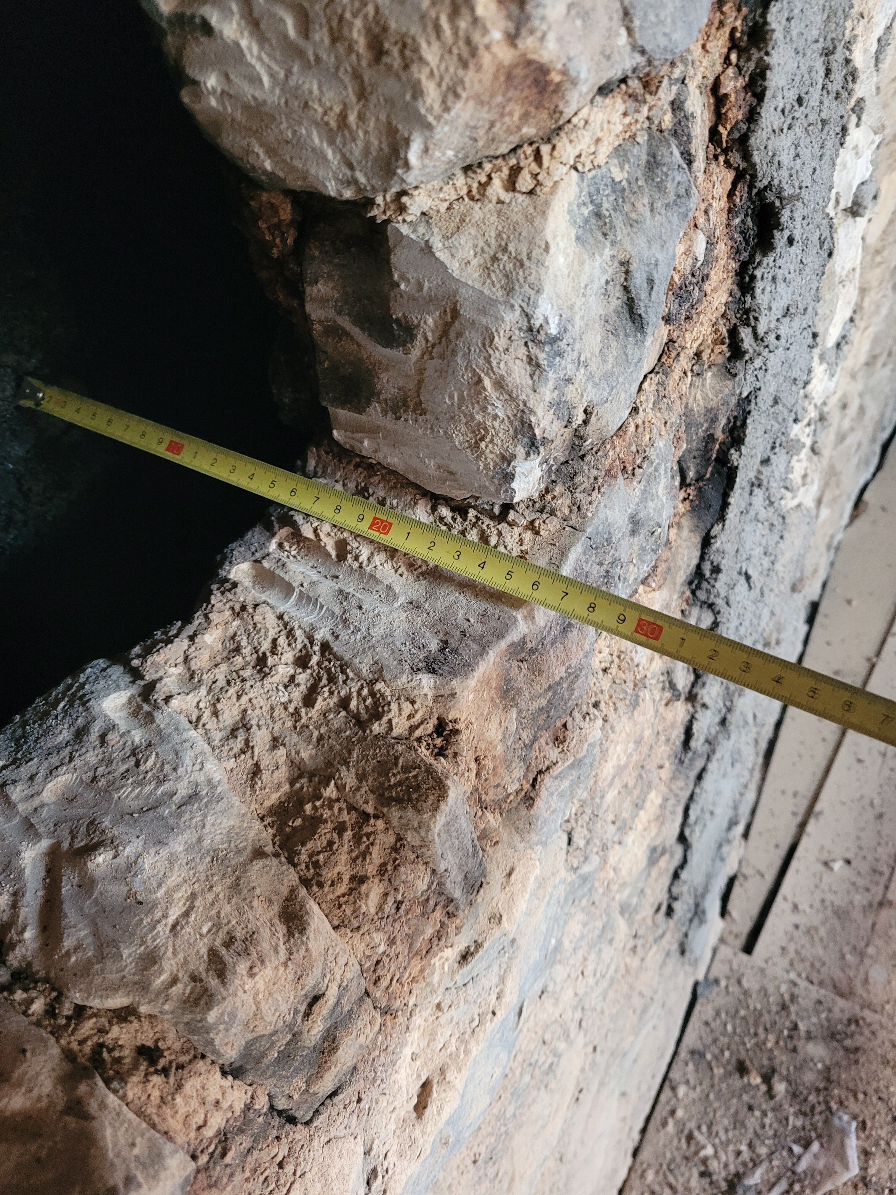 Le second va jusque 27 cm de l’autre côté, ce qui laisse 30 cm de moellons entre les deux conduits.