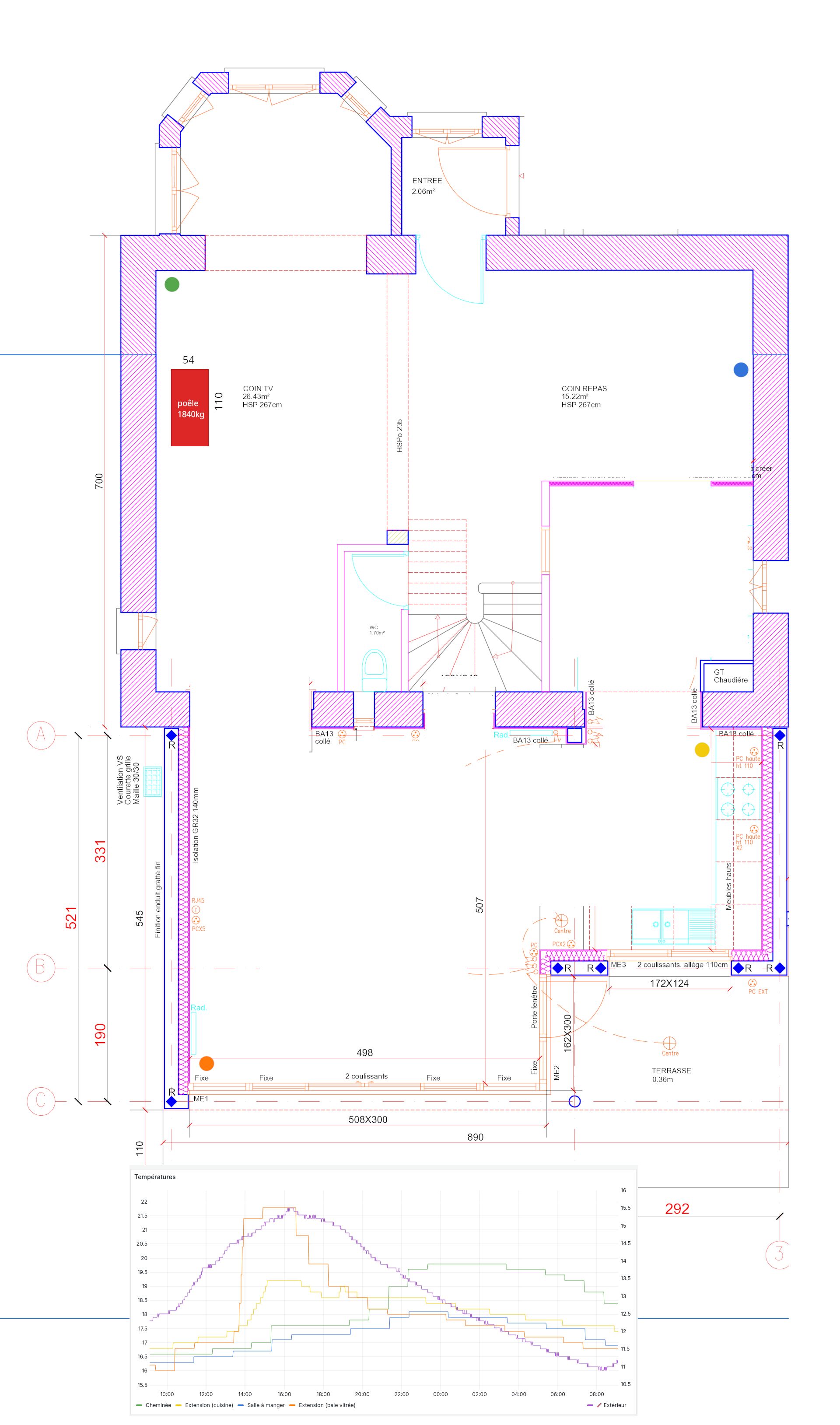 Voici le plan du rez de chaussée (la partie sud avec les murs moins épais a été ajoutée il y a 3 ans et est isolée).
