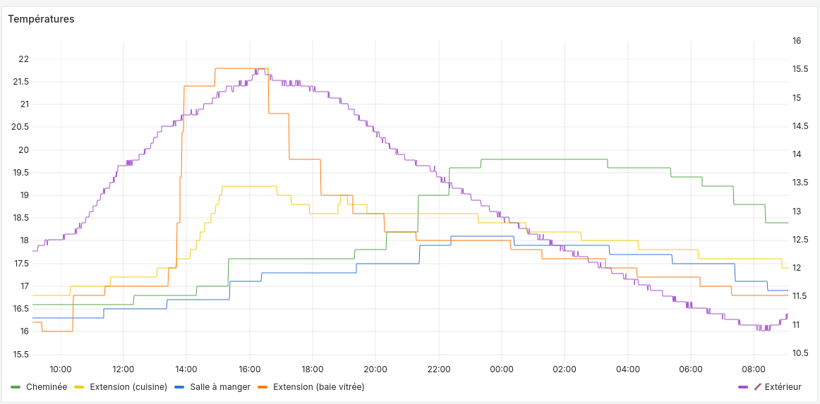 Vers 20h00 j’ai lancé une flambée dans le poêle, ce qui se ressent bien sur la courbe verte (thermomètre à 1.4 mètres du poêle, qui prend 2 degrés), mais assez peu sur la courbe bleue (thermomètre en face du poêle à environ 8 mètres, et le poêle « voit » le thermomètre). Ça me semble étrange que la courbe bleue ne soit pas plus influencée que ça par la flambée.