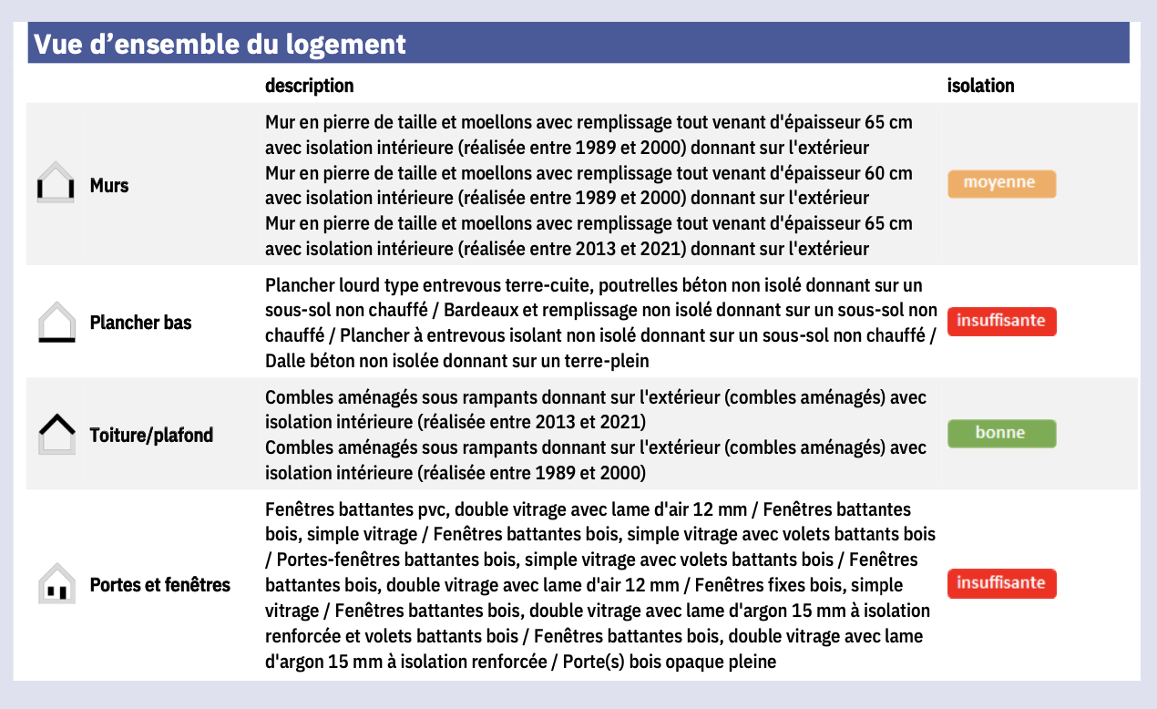 Il s’agit d’un mas cévenol en pierre qui a été isolé en laine de verre sous placo en 1991 (soit il y a près de 35 ans) Pour le DPE cette maison est notée F. Comme c’était jusque là une résidence secondaire elle n’a qu’une cheminée et des radiateurs électriques ce qui n’est pas concevable pour une habitation à l’année.